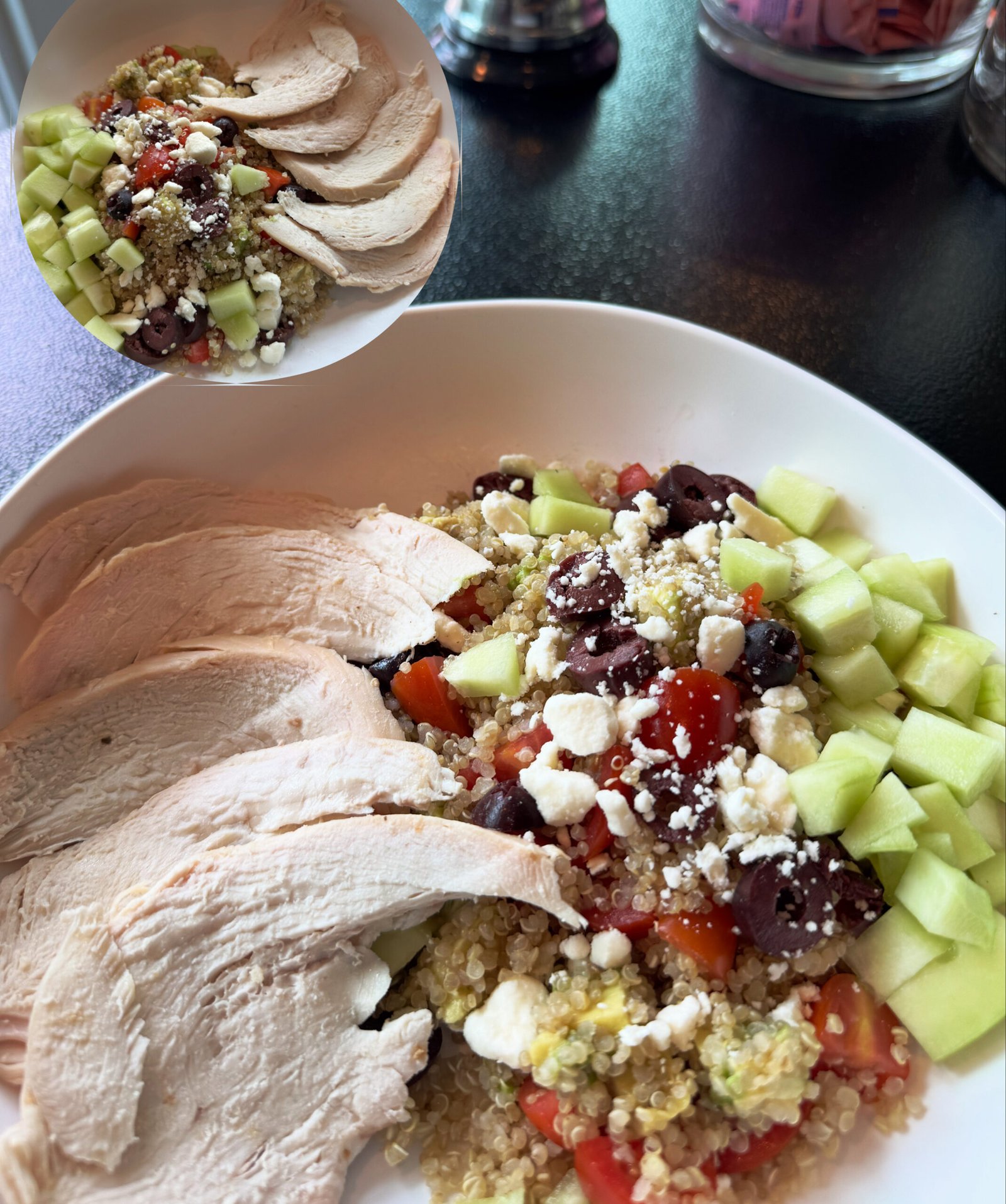 A nutritious base of cooked-to-order quinoa, accompanied by tender chicken, cherry tomatoes, creamy avocado, feta cheese, Kalamata olives, and fresh cucumber.