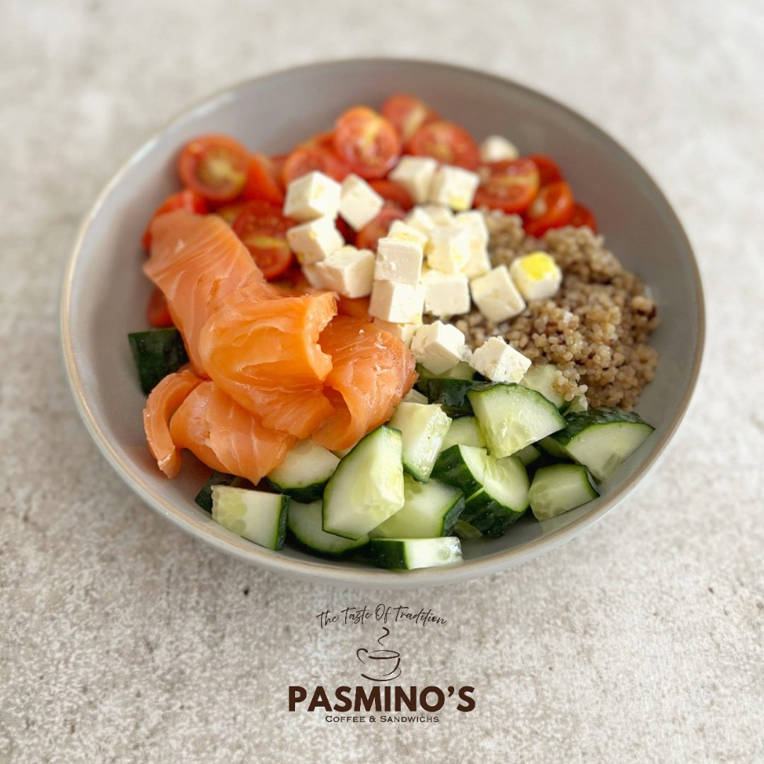 A nutritious quinoa base prepared to order, accompanied by smoked salmon, cherry tomatoes, creamy avocado, feta cheese, Kalamata olives, and fresh cucumber.
